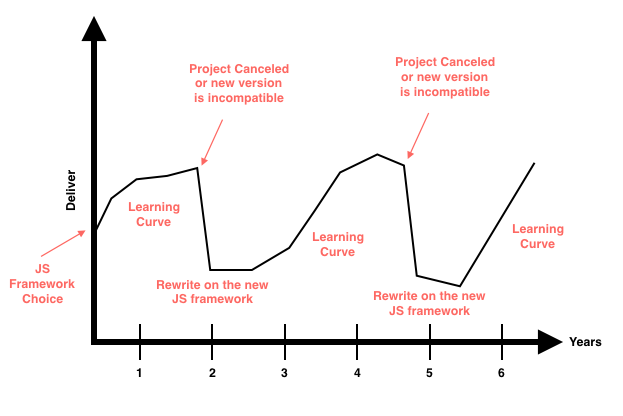 The problem with that approach is that we need to decide the JS framework on the first day of the project. But the reality is that this will have to last to support business as long as business needs.