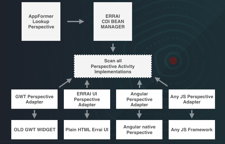 To integrate with any external web framework, a new adapter that maps to the target interface and register needs to be implemented. Its implementation takes place in the Errai Bean Manager. After this, everything will become an implementation of the same contract and transparent for the use cases. Here is an example of how we already do this with Angular code.