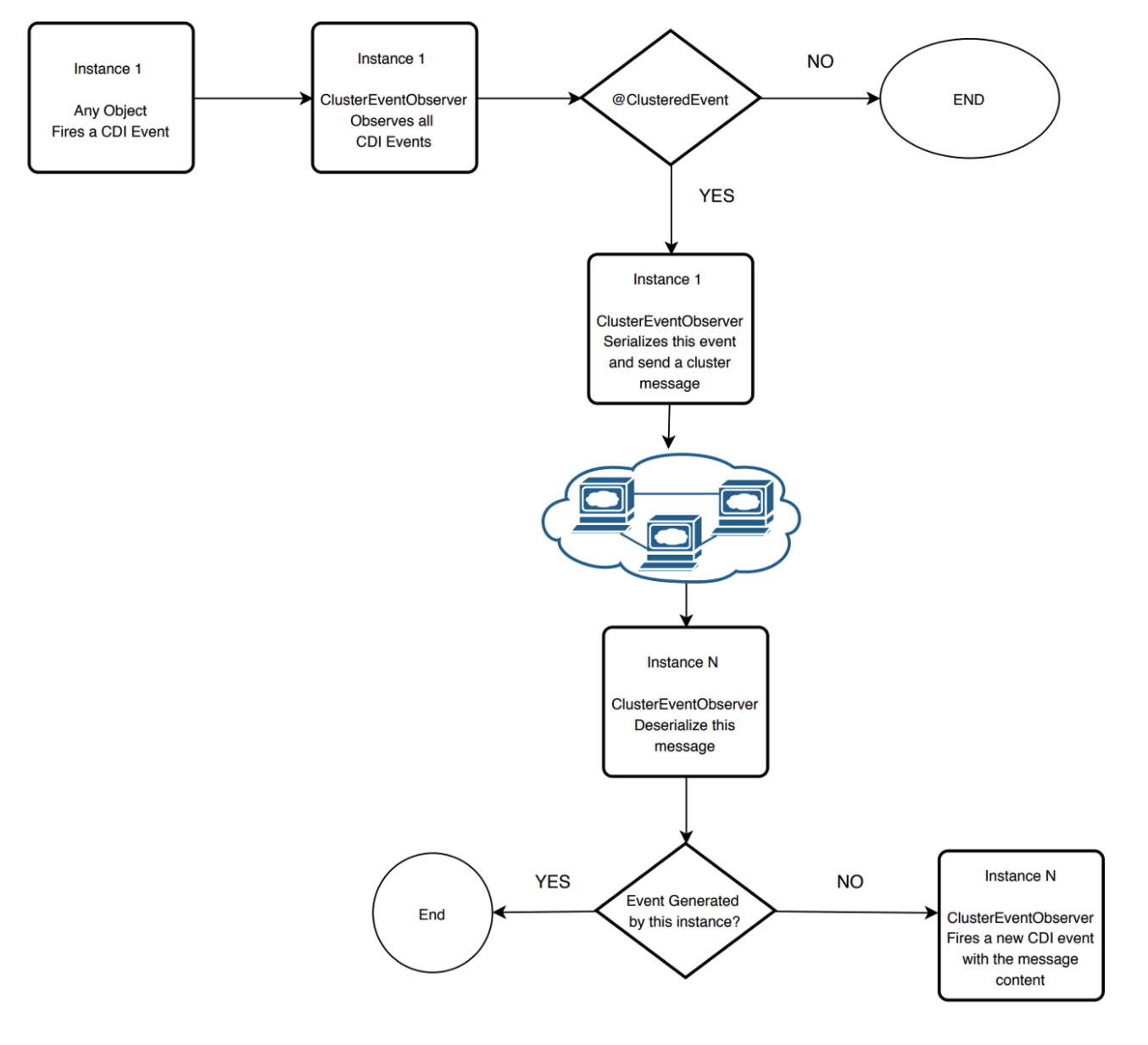 So basically, what my invention do is to observe all CDI events and if a CDI event object type has @Clustered annotation, we sent a serialised cluster message with all event data, deserialise on other nodes and regenerate a new CDI event.