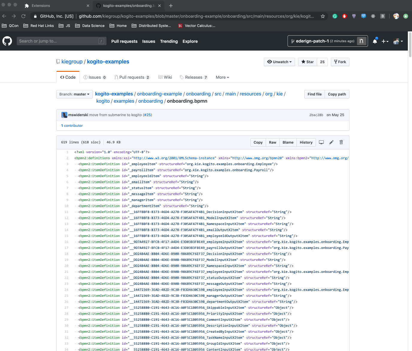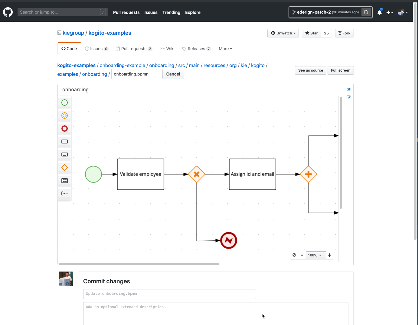 With the BPMN Github Chrome extension installed, every time that you are editing a BPMN/BPMN2 file, instead of seeing the huge XML file you will be using our BPMN graphical editor. After you modify the file you will be able to commit or send a PR directly from the GitHub interface.