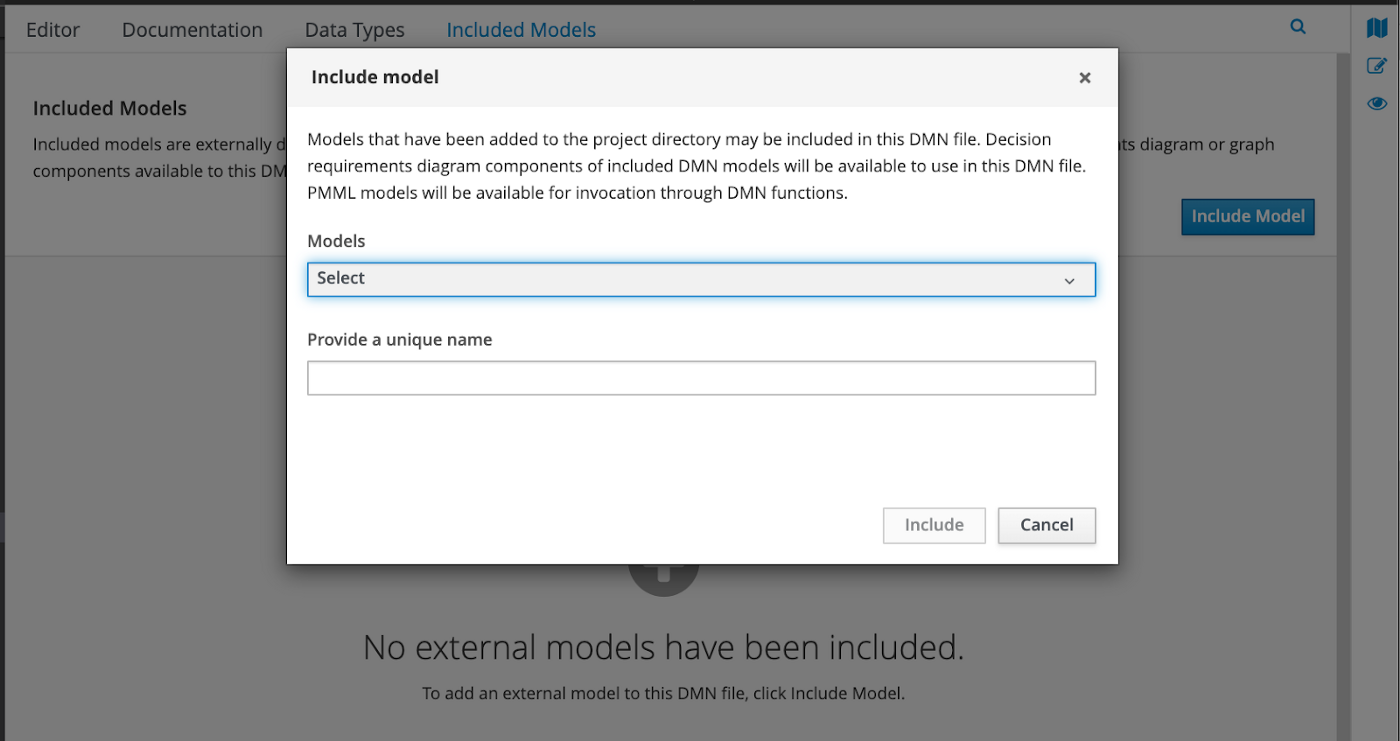 A PMML file can be linked to a DMN file using the “Included Model” tab. Pressing the Include Model button, a popup with a selection box containing all PMML and DMN files inside the same directory of the opened DMN file should appear.