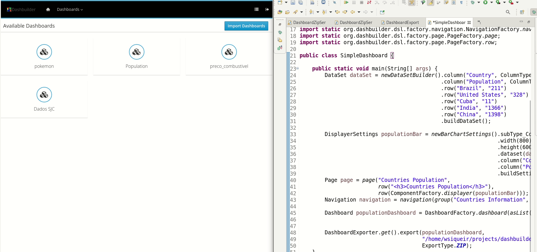 Using the Declarative Programmatic API, you can create their Dashboards, pages, components, and data sets directly on Java. Here is an example of the usage of such API: