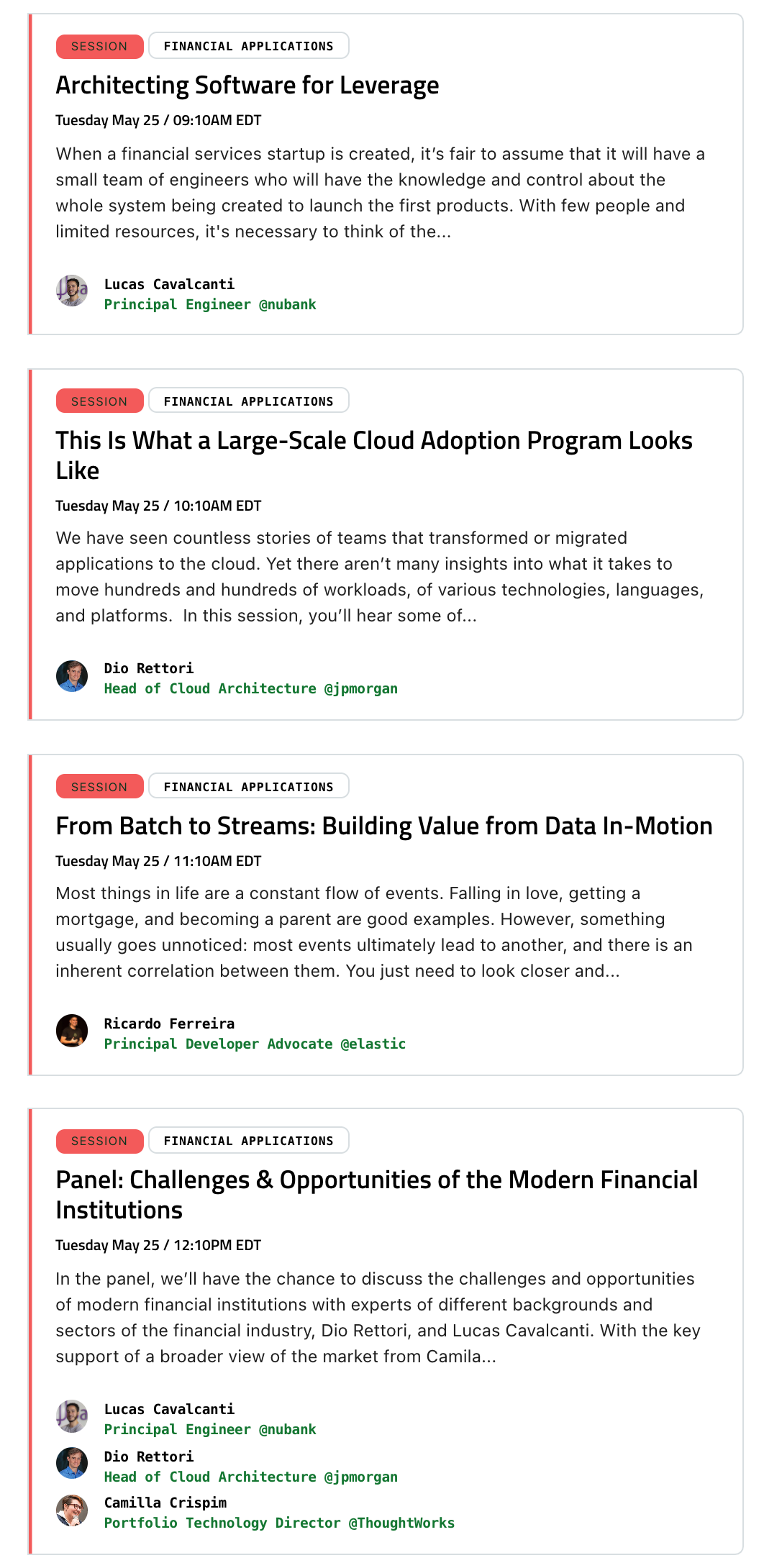 Track abstract: Financial institutions are experiencing a radical transformation. From building a disruptive FinTech, able to scale and grow in this competitive landscape to modernize a traditional financial institution, reorganizing how it conducts business in this new era, most of those innovations are enabled by modern software architectures. In this track, we'll explore the architectural and organizational challenges these traditional players and pioneers face as they change up through the gears and alter the face of finance across the world.