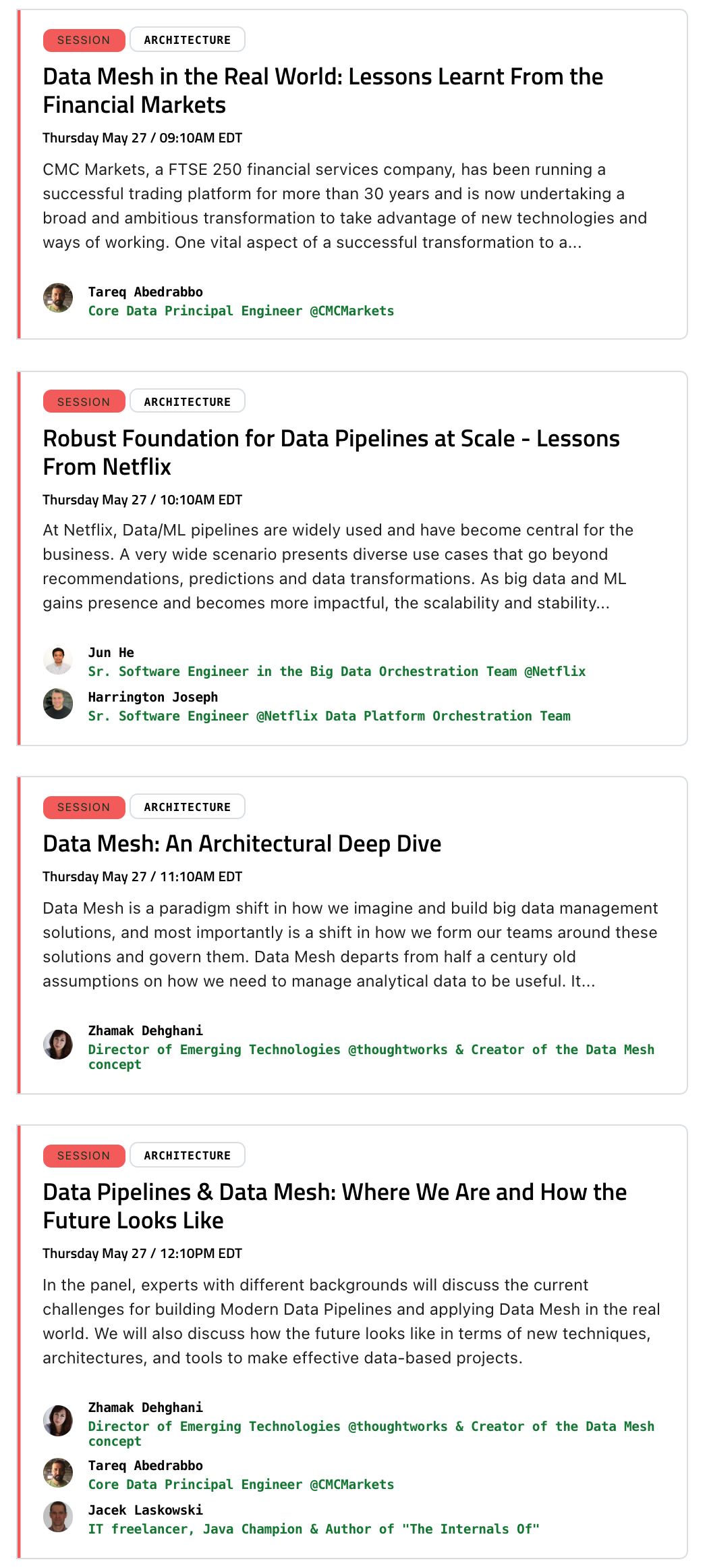 In this track, we will discuss emerging solutions for creating modern data pipelines that can solve common challenges in today's world of data: data engineering bottlenecks, data pipelines deployment in production, data discover, and more. We will also dive into the concept and application of Data Mesh, a new paradigm do organize and distribute data in an organization.